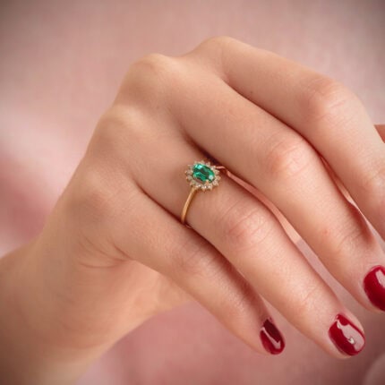 La alta joyería convertida en joya, la podrás descubrir en este precioso anillo tipo solitario realizado en oro amarillo de 18 kilates, acompañado por una preciosa esmeralda sintética de intenso verde, que va acompañada por un radiante orla de diamantes de laboratorio por un total de 0,140 ct. Una joya especial, diseñada para completar los días más especiales.