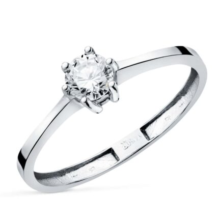 Sencillo y clásico anillo realizado en Oro blanco de 18 kilates y terminación brillo. Diseño formado por un aro fino tipo cuchilla, que viene acompañado por seis garras en su parte superior que recoge un diamante central en talla brillante de 0,30 ct. Un modelo perfecto para elevar cualquier look.
