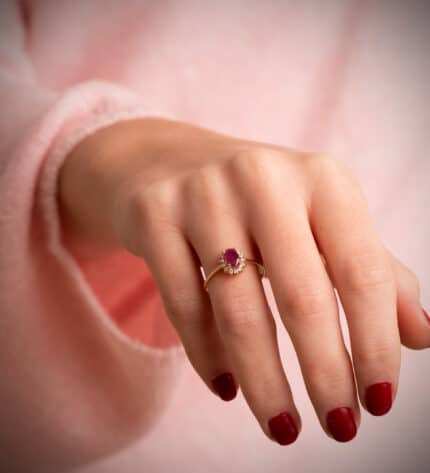 La esencia de la alta joyería se materializa en este exquisito anillo solitario de compromiso, elaborado en oro amarillo de 18 kilates. En su centro brilla un rubí sintético de intenso color rojo, símbolo de pasión y eternidad, realzado por una deslumbrante orla de diamantes de laboratorio en talla brillante que multiplica su luz y sofisticación.
