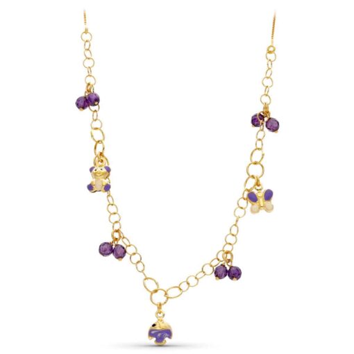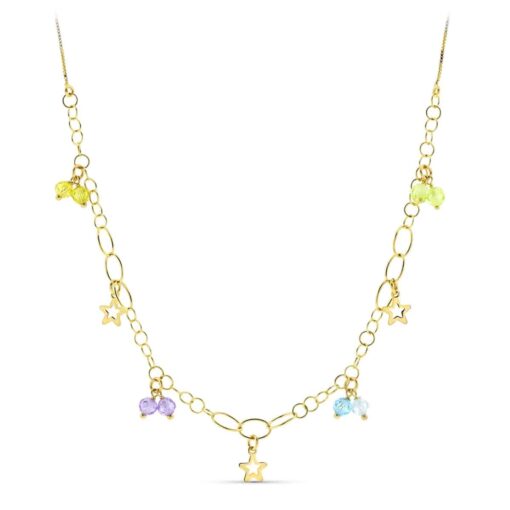 Preciosa gargantilla en Oro amarillo de 18 quilates, acompañada por varias piedras colgantes de color. Joya sencilla perfecta para vestir en tu día a día.