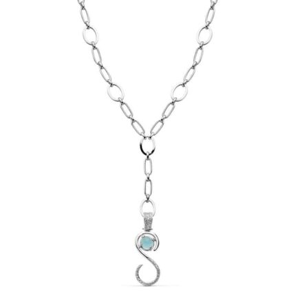 Preciosa gargantilla elaborada en Oro blanco de 18 Quilates, con una longitud de 45 cm. Contiene un sencillo colgante en forma de "S", en cuya parte superior encontramos una pequeña Circonita azul que sin duda hace que sea una pieza inigualable, perfecta para destacar.