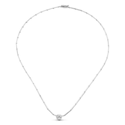 Preciosa gargantilla elaborada en Oro blanco de 18 quilates. Su bonito diseño en terminación brillo, incluye un pequeño chatón de Circonita que hace de esta una pieza única. Si buscas un complemento perfecto para lucir en el día a día, acertarás.
