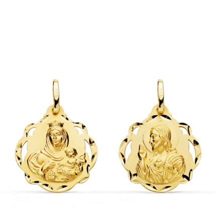 Tradicional medalla tipo escapulario con la Virgen del Carmen y Corazón de Jesús. Realizada en Oro amarillo de 18 kilates, con 20 mm de diámetro, que va acompañado por calados y tallados tipo hélice, que le dan un toque de lo más original.
