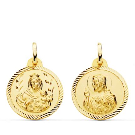 Medalla Escapulario 20 mm Virgen del Carmen y Corazón de Jesús Oro Amarillo 18K Borde Brillo
