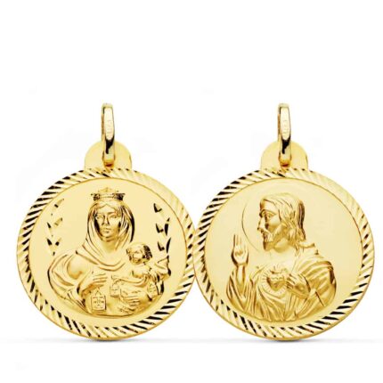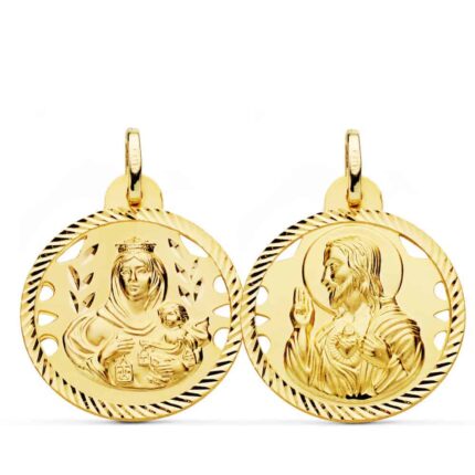 Tradicional medalla tipo escapulario con la Virgen del Carmen y Corazón de Jesús. Realizada en Oro amarillo de 18 kilates, con 24 mm de diámetro, que va acompañado por calados y tallados tipo hélice, que le dan un toque de lo más original.
