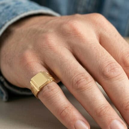 La robustez y el arte se unen en este sello macizo de oro amarillo de 18 kilates, una pieza de alta joyería que destaca por su imponente presencia. El diseño rectangular de la parte superior, con su contraste entre el acabado mate y el brillo pulido del marco, se complementa con unos laterales ricamente tallados que capturan la luz desde cualquier ángulo. Es una elección idónea para quienes buscan una joya con carácter y durabilidad, perfecta para marcar hitos generacionales o celebraciones de especial relevancia como una comunión. Su composición sólida asegura que mantenga su forma y valor con el paso del tiempo, convirtiéndose en un legado personal cargado de significado que permite un grabado personalizado en su zona frontal.