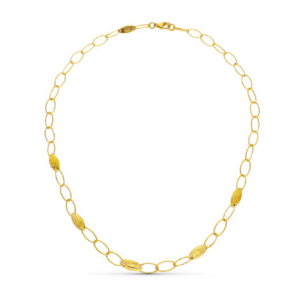 Clásica pieza de la joyería tradicional. Gargantilla elaborado en Oro amarillo de 18 quilates, acompañado por elegantes tallas en los eslabones. Una pieza esencial a tener en tu joyero.