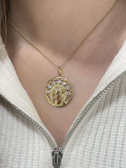 Clásica Medalla de 18 mm de diámetro realizada en Oro amarillo 18 kilates, con un diseño clásico y para toda la vida de la Virgen María rezando, imagen central con un realista relieve y terminación brillo. Una joya elaborada para toda la vida. Puedes encontrarla en nuestras tiendas de Málaga, o si lo prefieres, puedes encargarla online y te la enviamos a casa.