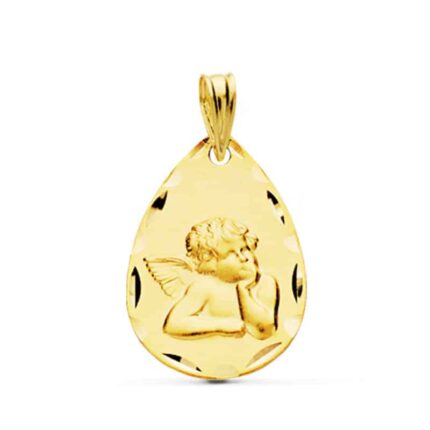 Medalla bebé de 19 x 11 milímetros y 1,10 gramos, realizada en Oro Amarillo de 18 Quilates. Diseño con forma de gota, compuesto por la silueta a relieve del Ángel Burlón, con tallado lateral y en terminación brillo.
