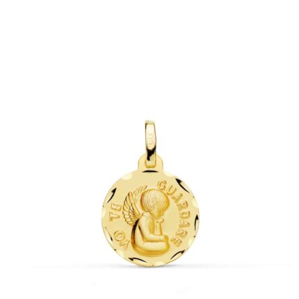 Original y clásica medalla realizada en Oro amarillo de 18 kilates, pensada para niño o niña. Perfecta para regalar en la primera comunión, por ir acompañada del cariñoso y protector Ángel Burlón".