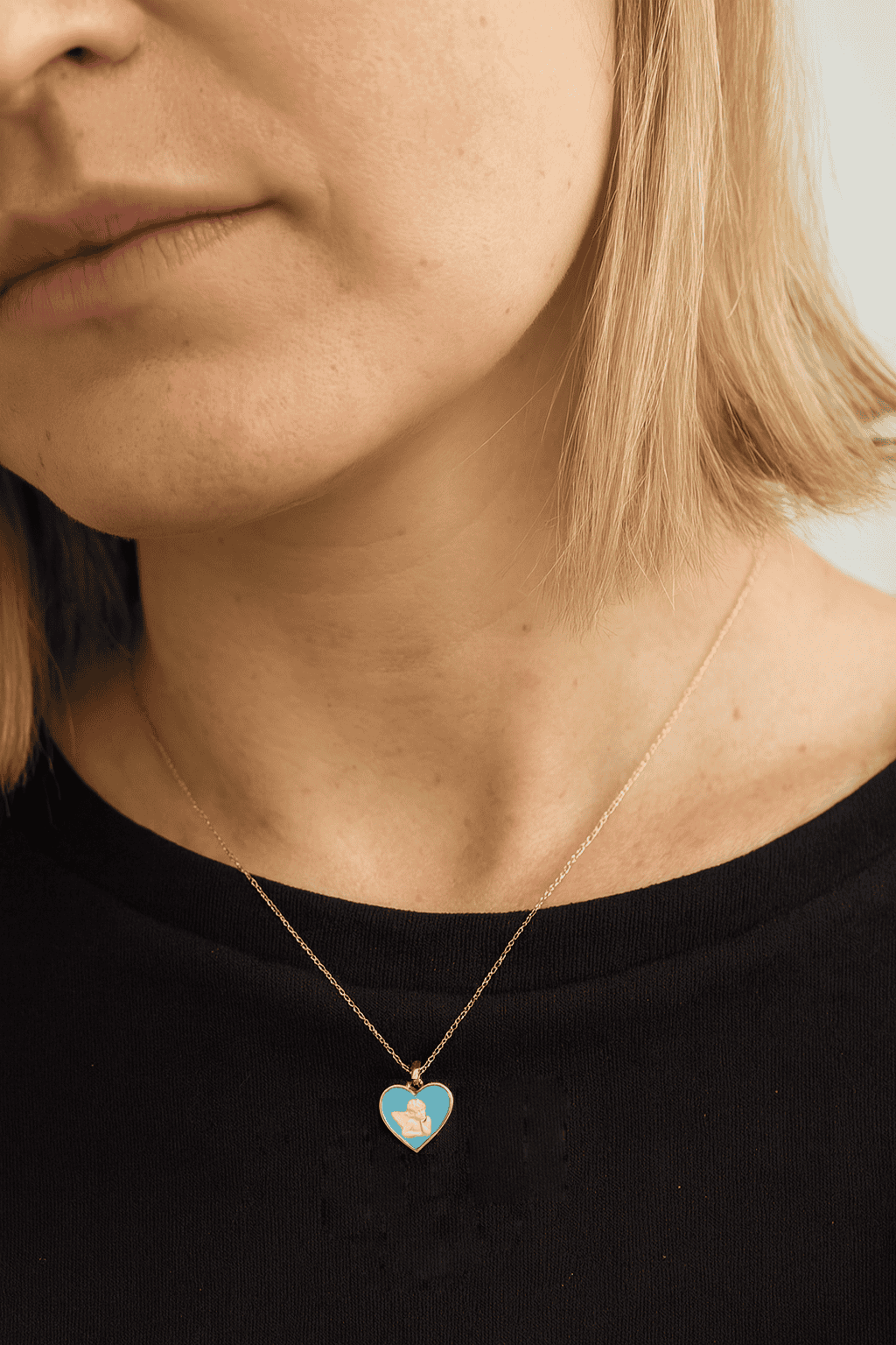 Medalla Bebé de 14 milímetros, realizada en Oro Amarillo de 18 kilates. Diseño formado por forma de colgante a modo de corazón, esmaltado en su frontal de color celeste y silueta del ángel burlón en terminación brillo.