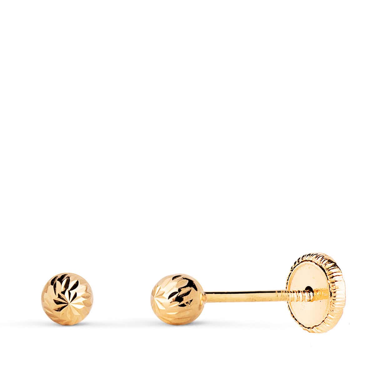 Pendientes bola huecos de 3 milímetros para bebé, realizados en Oro Amarillo de 18 kilates, con diseño de tallado sencillo y acompañadas por clásicos cierres a rosca.