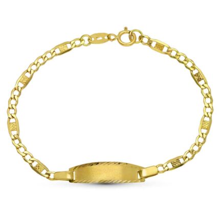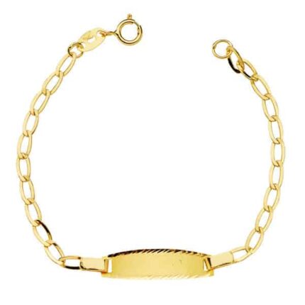 Una de sus primeras joyas y personalizable con su nombre, fecha o iniciales. Esta pulsera tipo esclava, está elaborada en Oro amarillo de 18 kilates y formada por sencillos eslabones tipo Bilbao. Modelo infantil perfecto para crecer con él o ella.