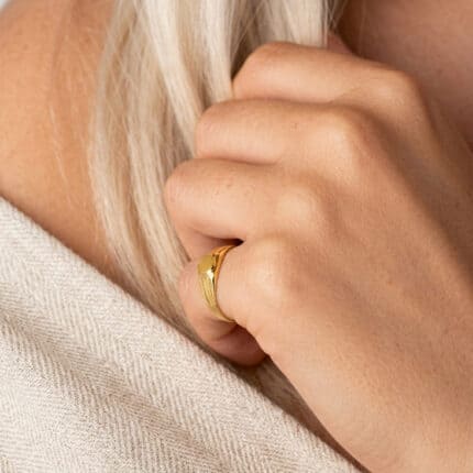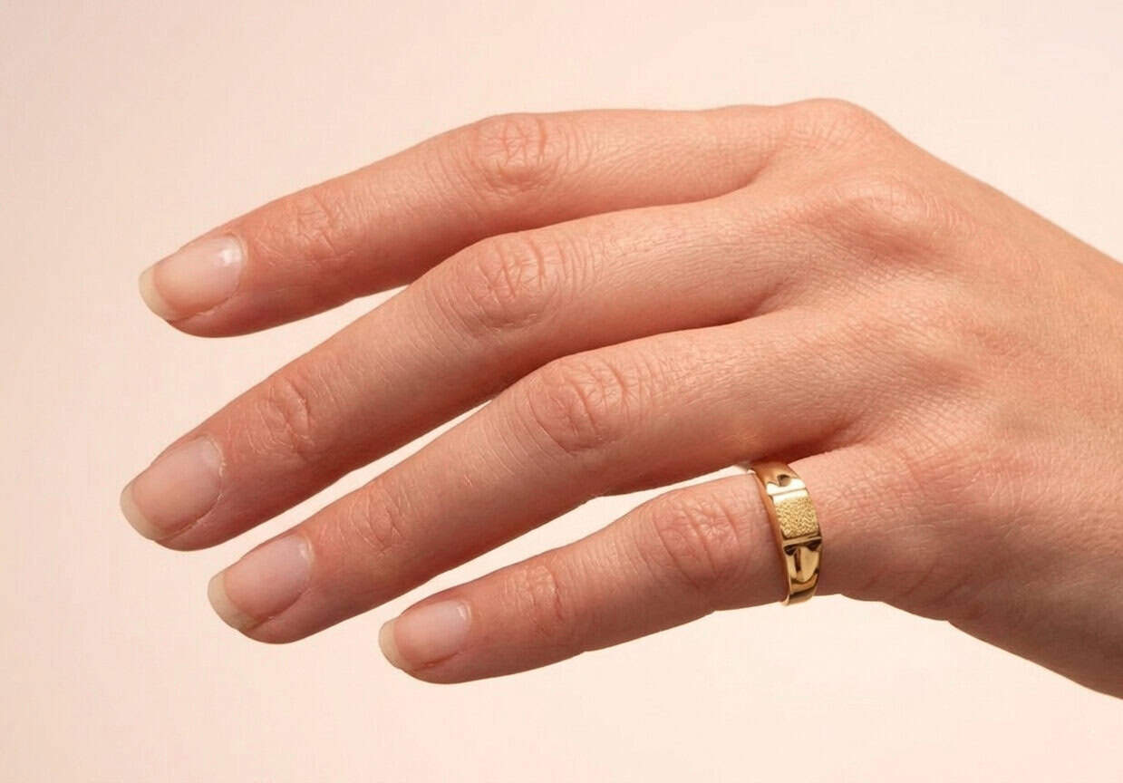 Sello de Oro amarillo de 18 kilates con un diseño rectangular de 5 x 4 mm y acabado en brillo. Su estructura hueca y su peso aprox. de 0,65 g permiten que sea un accesorio ligero y cómodo, ideal para bebés o para ser lucido con distinción en el dedo meñique.