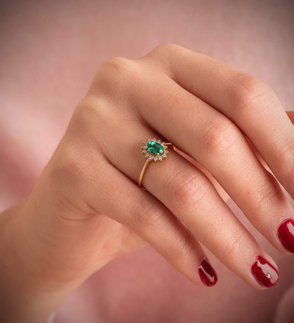Este anillo de compromiso combina la elegancia atemporal del oro de ley con la sofisticación de las piedras preciosas. La esmeralda de talla oval se ve realzada por un halo de diamantes que potencia su color y luminosidad, siendo una joya diseñada para completar los días más especiales. Como todas nuestras piezas, cuenta con su contraste correspondiente por ley, lo que garantiza la calidad certificada del oro de 18 kilates.