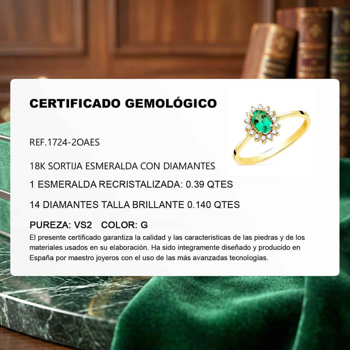 Fabuloso anillo tipo solitario de compromiso realizado en Oro Amarillo de 18 kilates, con Esmeralda sintética central de 0,39 quilates en talla oval y medidas 6 x 4 mm. Joya complementada con una elegante orla de Diamantes de laboratorio en talla brillante, por un total de 0,140 ct, con color/calidad VS2-G.