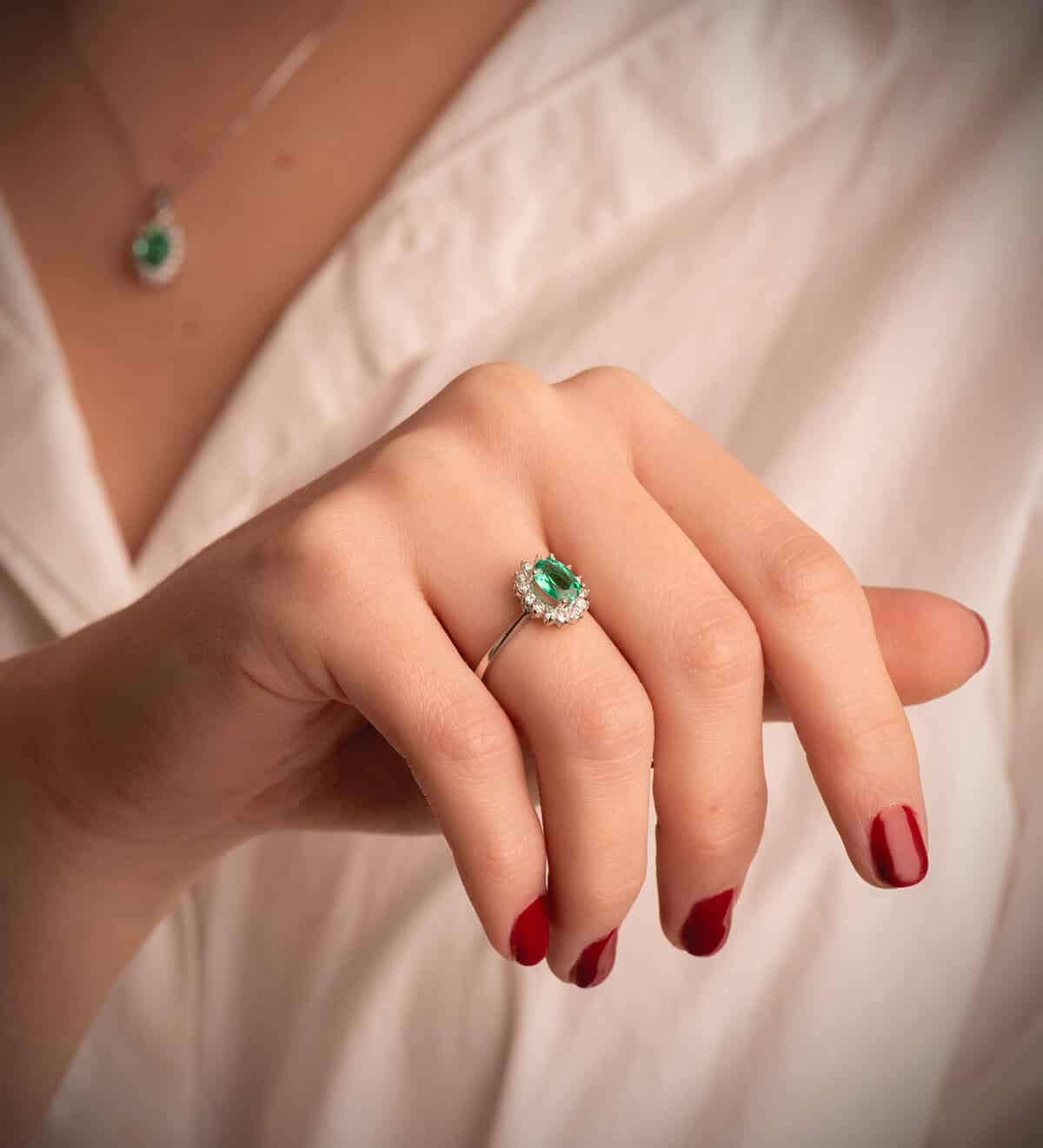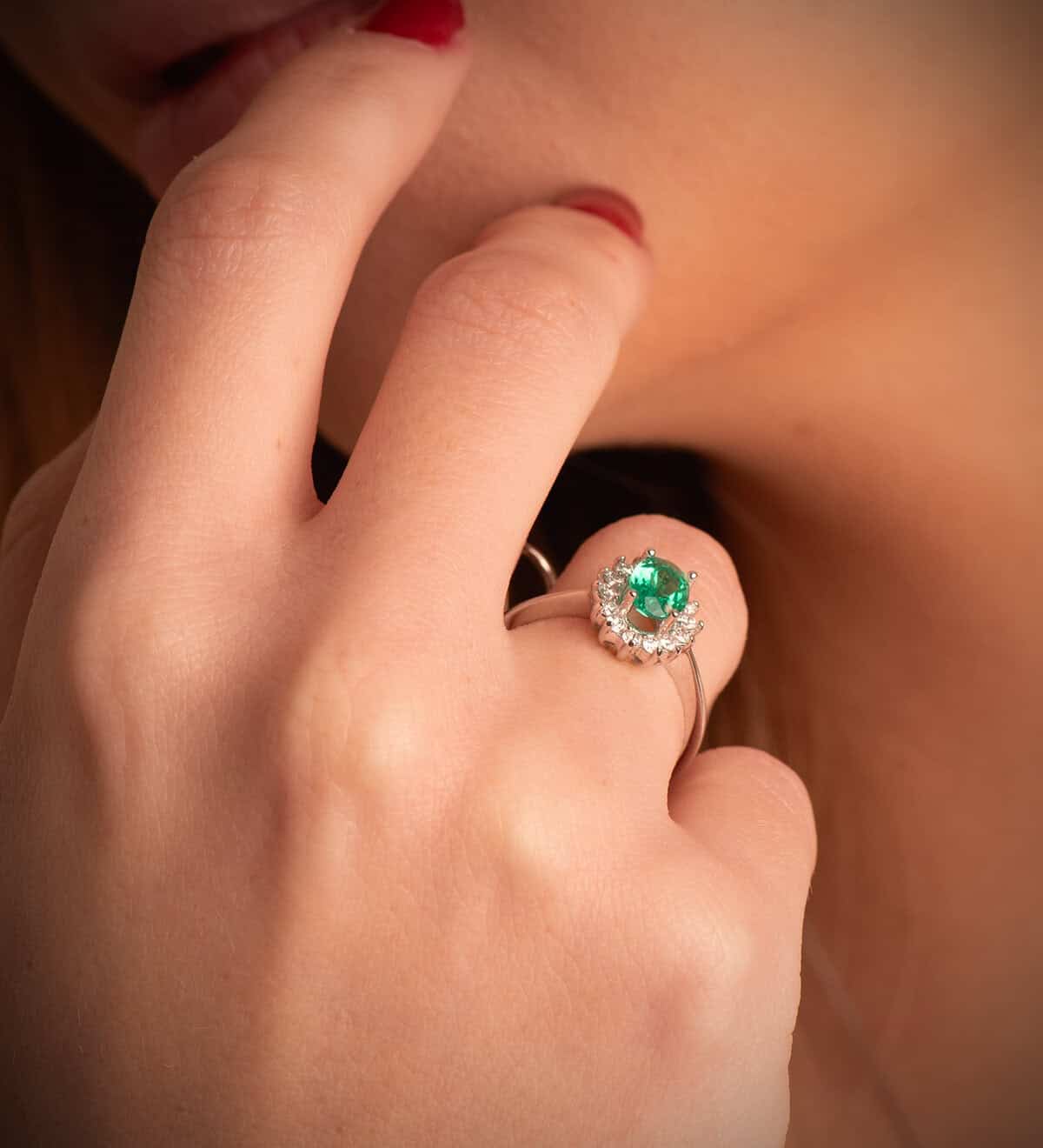 La alta joyería convertida en joya, la podrás descubrir en este precioso anillo tipo solitario de compromiso realizado en oro blanco de 18 kilates, acompañado por una preciosa esmeralda sintética con intenso verde y acompañada por una radiante orla de diamantes de laboratorio. Una joya especial, diseñada para completar los días más especiales.