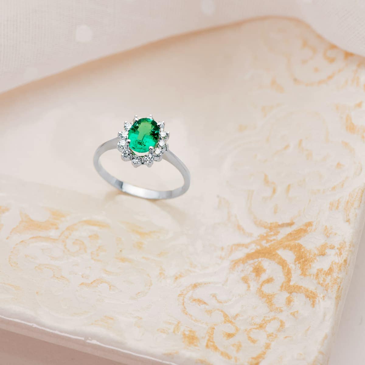 La alta joyería convertida en esta magnifica pieza, la podrás descubrir en este precioso anillo tipo solitario de compromiso realizado en oro blanco de 18 kilates, acompañado por una preciosa esmeralda de intenso verde, que va acompañada por una radiante orla de diamantes en talla brillante. Una joya especial, diseñada para completar los días más especiales.