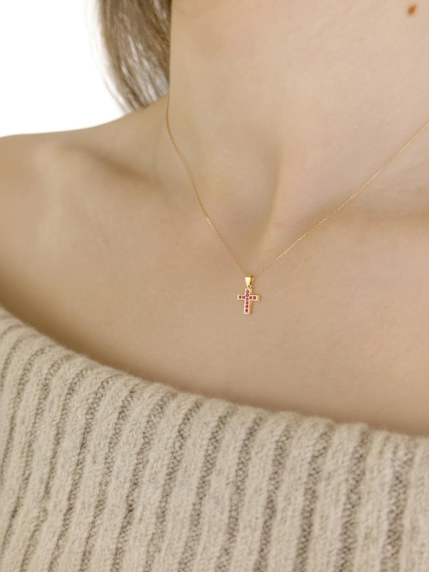 Cruz realizada en Oro amarillo de 18 kilates con unas medidas de 13,5 x 10 mm. Este diseño destaca por el elegante contraste de sus circonitas rojas engastadas, ofreciendo un estilo minimalista y sofisticado.