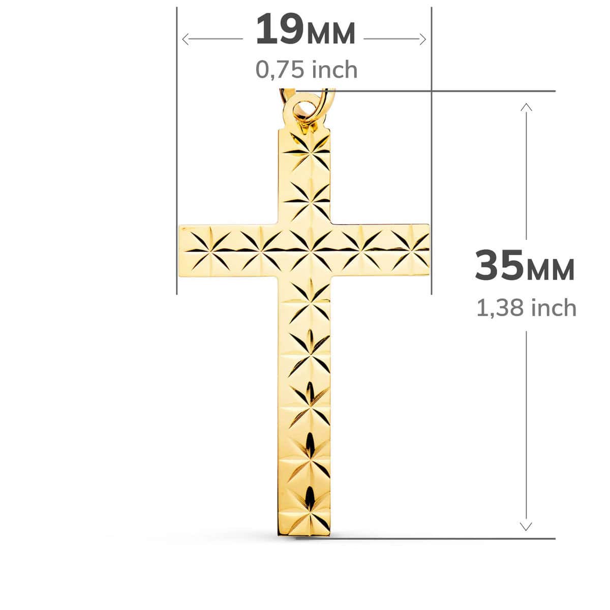 Cruz lisa de 35 x 19 milímetros con un peso de 1,20gr, realizada en Oro Amarillo de 18 kilates y diseño plano con tallados en forma estrellada.
