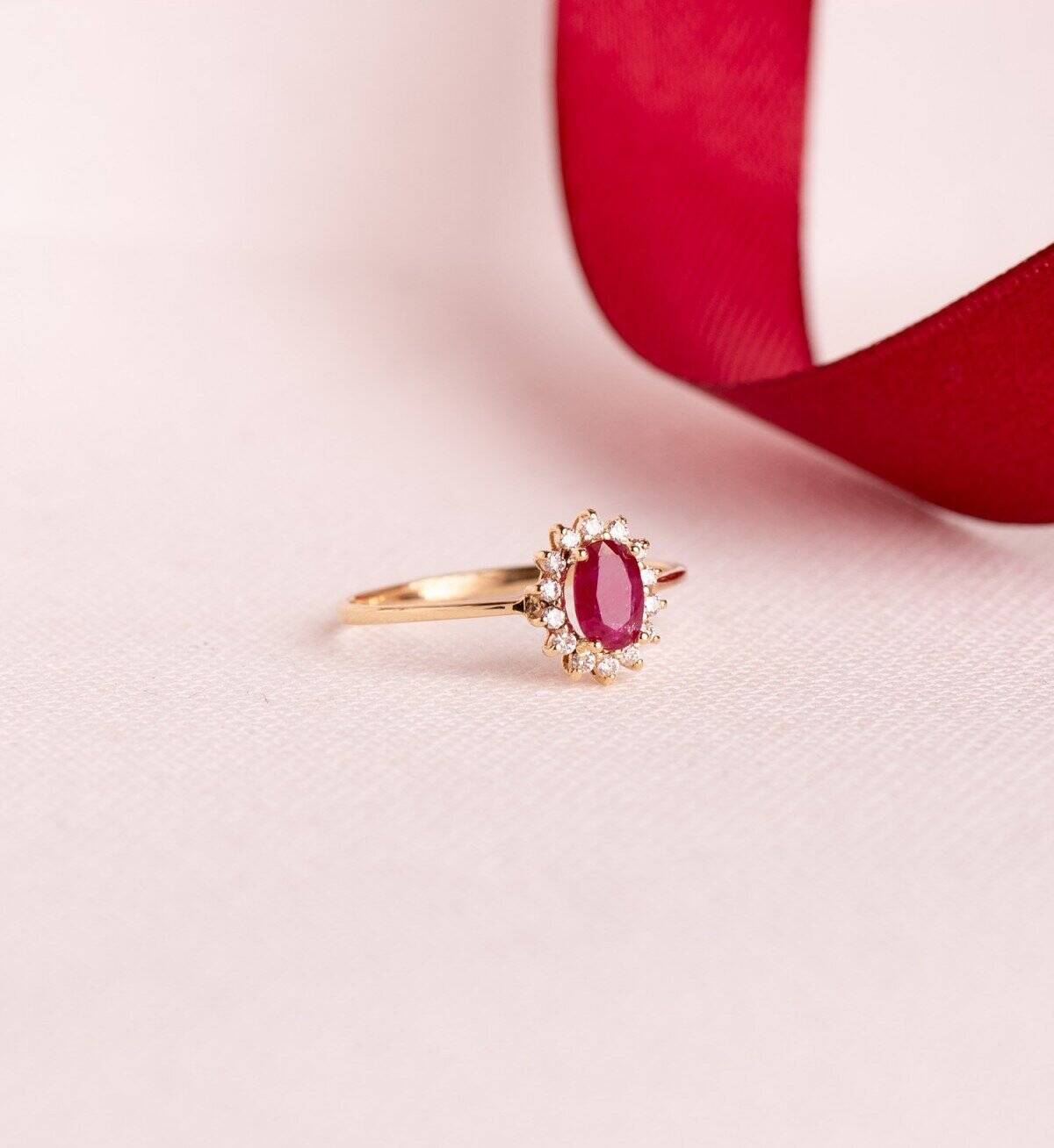 Excelente anillo tipo solitario de compromiso realizado en Oro Amarillo de 18 kilates, con Rubí sintética de 6 x 4 mm en talla oval con un peso de 0,55 kilates. Joya complementada con una elegante orla de Diamantes de laboratorio en talla brillante, con un total de 0,140ct y color/calidad VS2-G.