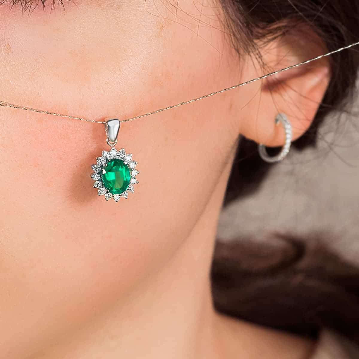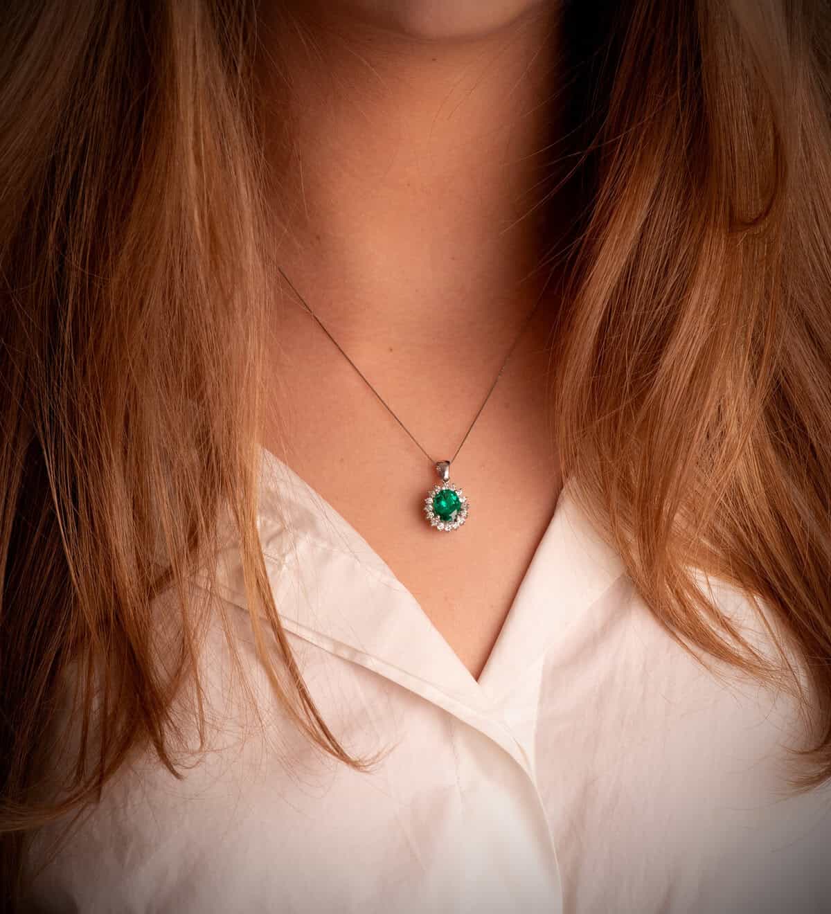 Clásico y discreto colgante de 9 x 7 mm aproximados realizado en Oro blanco de 18 kilates, con un colorido diseño formado por una intensa Esmeralda sintética central engastada junto a una orla de radiantes y elegantes Diamantes de laboratorio en talla brillante. Un colgante que deberás tener en tu joyero. Perfecto para las ocasiones más especiales.