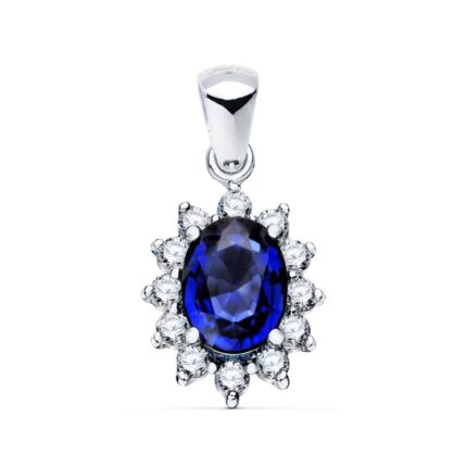 Clásico y discreto colgante de 13 x 11 mm realizado en Oro blanco de 18 kilates, con un colorido diseño formado por intenso Zafiro central engastado por una orla de radiantes y elegantes Diamantes de laboratorio en talla brillante. Un colgante que deberás tener en tu joyero. Perfecto para las ocasiones más especiales.