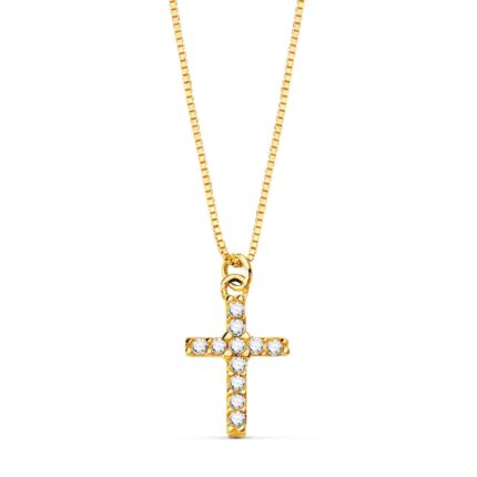 Este conjunto combina lo clásico y tradicional de la cruz, junto a la elegancia que aportan los Diamantes. Gargantilla elaborada en Oro amarillo de 18 kilates, la cual lleva engastados Diamantes en talla brillante por un total de 0,05 ct. Un modelo pequeño y cadena, que por su longitud, quedará cortita al cuello.