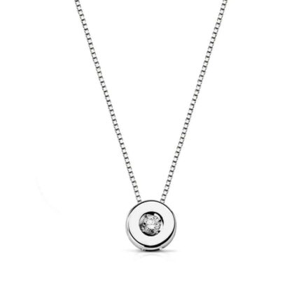 En numerosas ocasiones, las gargantillas con un colgante pequeño y sencillo, son las mejores para llevar y no quitarse nunca. Esta no es una más. Forma de chatón elaborada en Oro blanco de 18 quilates, que incorpora un radiante Diamante de 0,011 ct talla brillante en su centro. Este te lo puedes colgar en su original cadena veneciana de 42 cm y no quitártela nunca.