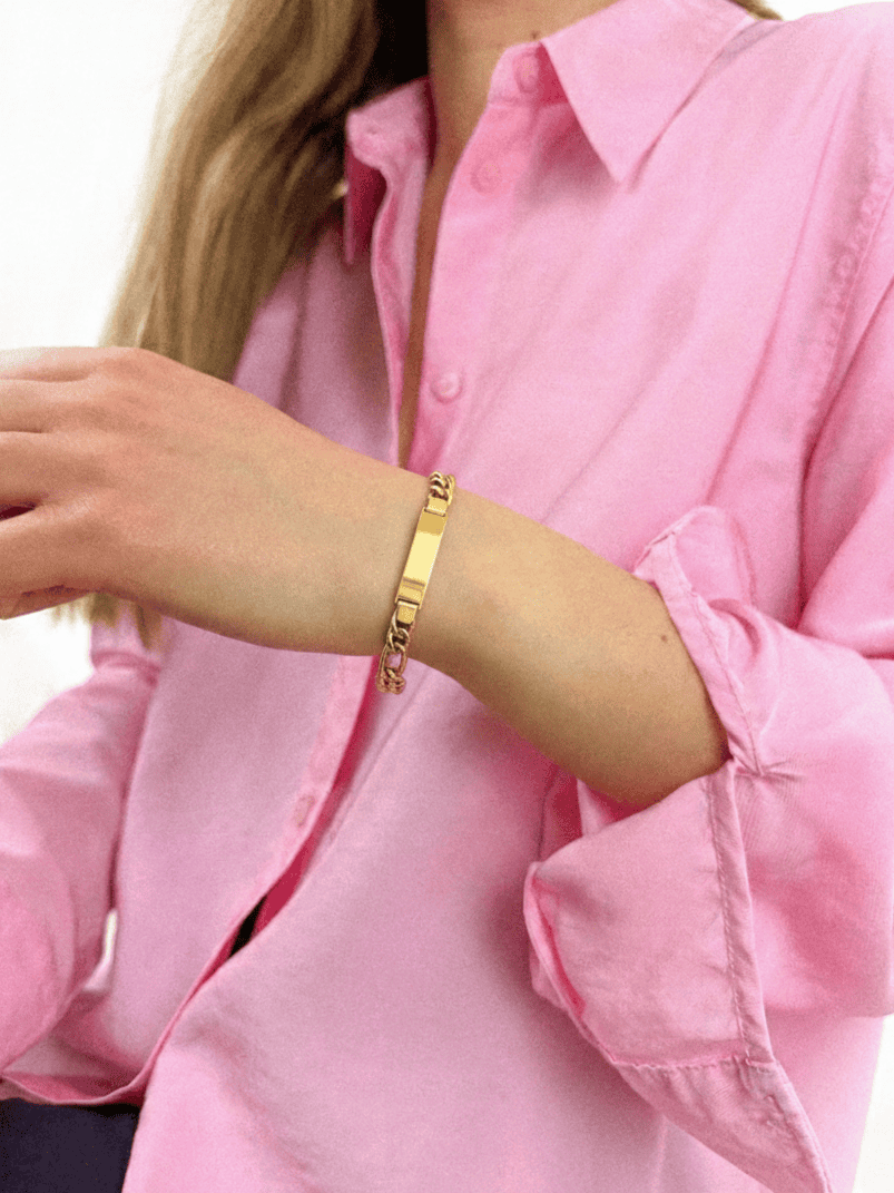 Esta pulsera esclava de oro amarillo de 18 kilates sobresale por su diseño robusto y atemporal, ofreciendo una amplia superficie frontal de 45 x 10 mm ideal para personalizar con un grabado especial de nombres o fechas. El estilo de eslabón Cartier aporta un toque de distinción, mientras que su fabricación garantiza una presencia imponente con una gran comodidad para el uso diario. Su acabado pulido a espejo realza la nobleza del oro de ley, asegurando una joya que mantiene su brillo y valor con el paso del tiempo.