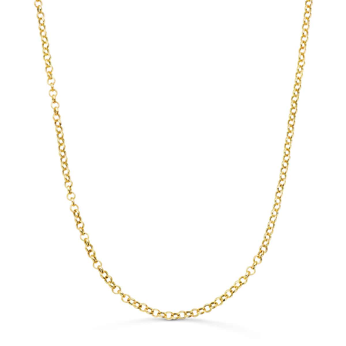Cadena Rolo realizada en Oro Amarillo de 18 kilates con 45 centímetros de longitud y fino grosor de 2,5 mm. Diseño sencillo de eslabones planos para llevar a modo de detalle en el cuello y acompañar si desea por un sencillo colgante.