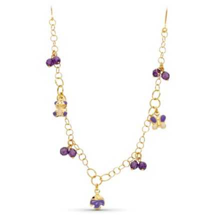 Precioso regalo con el que te asegurarás el que se lo ponga siempre. Una gargantilla elaborada en Oro amarillo de 18 quilates, con la combinación de preciosas chapas de distinto color y variados colgantes como estrellas y lunas. La combinación perfecta hecha joya. ¡No lo dudes más!