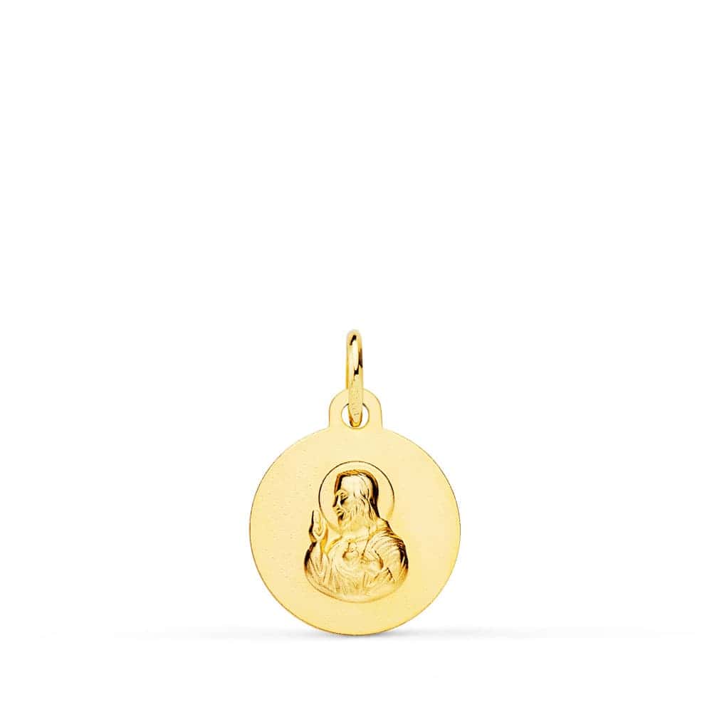 Tradicional medalla tipo escapulario con la Virgen del Carmen y Corazón de Jesús. Realizada en oro amarillo de 18 kilates, con 12 mm de diámetro en terminación matizada y un clásico bisel lateral.
