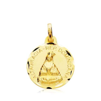 Medalla de 18 mm y 2,25 gr de peso, elaborada en Oro amarillo de 18 kilates. Diseño que combina fondo mate con imagen y bordes con bisel, donde podemos encontrar la imagen central de la «Virgen Caridad del Cobre» sobre balsa.
