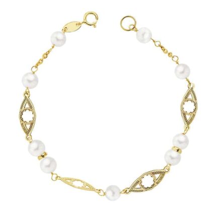 Pulsera tipo esclava para niña elaborada en Oro amarillo de 18 quilates. Tiene 16 cm de longitud y 2,55 gr de peso y cuenta con un diseño en terminación brillo. Incorpora una placa de grabación y una pequeña pera intercalada.