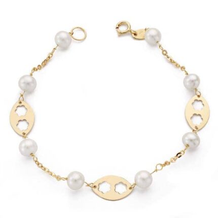 Pulsera Niña 17,5 cm en Oro Amarillo 18 Quilates con Piezas Caladas y Perlas Cultivadas