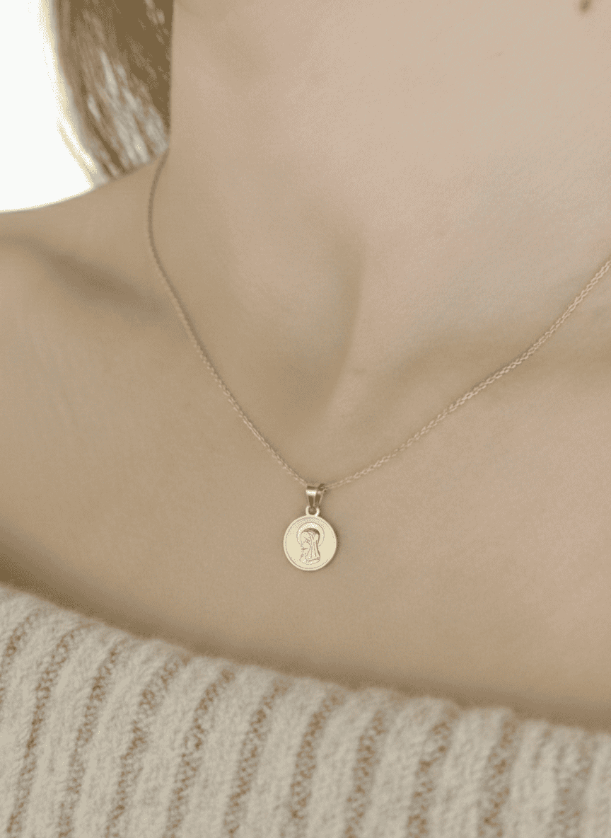 Medalla realizada en Oro Amarillo de 18 kilates con un diseño circular de 14 mm que representa la imagen de la Virgen Niña. Esta joya destaca por su acabado detallado y su relieve suave, siendo una opción ideal para ocasiones especiales como bautizos o comuniones.