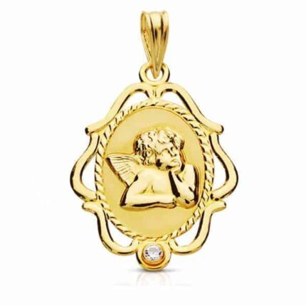 Original y clásica medalla realizada en Oro amarillo de 18 quilates, pensada para niña. Perfecta para regalar en la primera comunión, por ir acompañada del cariñoso y protector Ángel Burlón".